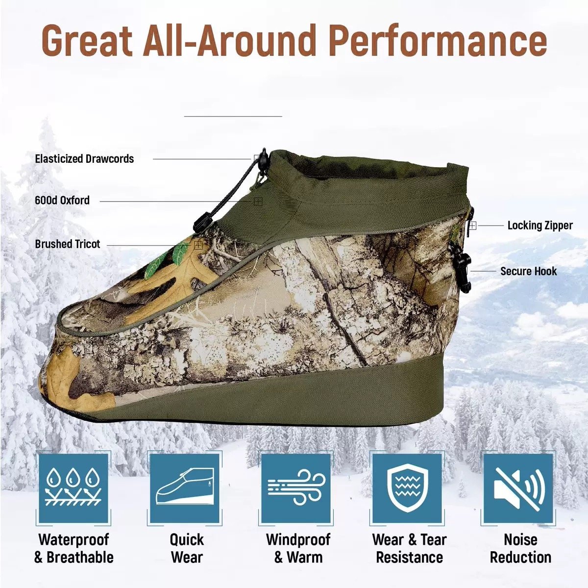 Designed to slip directly over your shoes or boots. The adjustable drawcord and durable zipper provide a snug, secure fit—allowing quick on/off during hunting, fishing, or camping without removing your footwear.