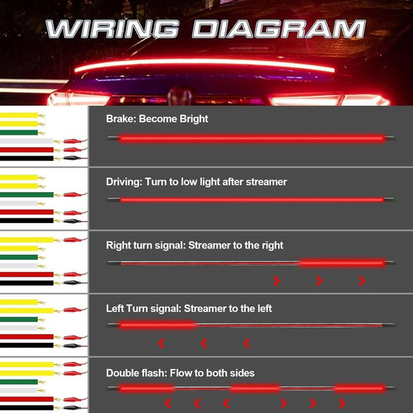 | Multiple Lighting Effects | Choose from a variety of lighting modes, including steady on, flashing, and breathing effects. Whether you're looking for a bold, attention-grabbing effect or a subtle, stylish glow, the LED Tail Light Strip has a mode for every occasion. |
