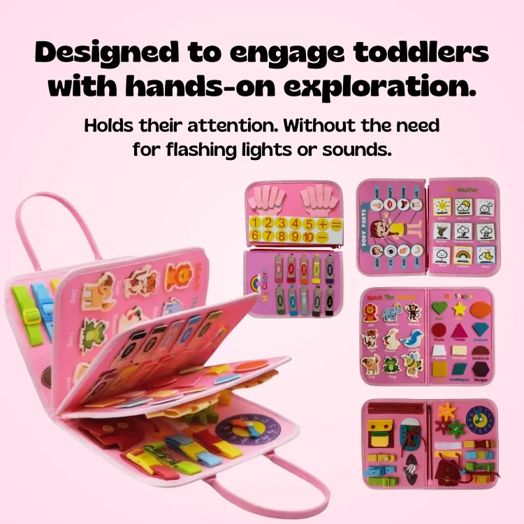 Watch them zone in on real activities—zippers, buckles, puzzles—instead of zoning out to a screen. Real focus that builds their brain while saving your sanity. No batteries. No guilt. Just peace when you need it most.
