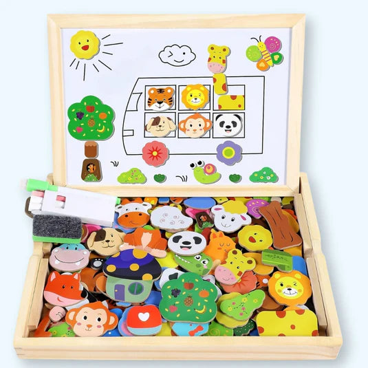 By manipulating the magnetic pieces and drawing freely, your child develops fine motor skills and stays engaged for hours — no screens needed.