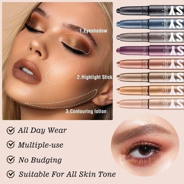 12 different colors, including shimmer & glitter & metallic effects eyeshadow stick, apply it on the eye area and you are done, you can try multiple colors. The smooth shimmer glitter eyeshadow sticks effectively highlight the eye contour, create gorgeous eye makeup, and make you the eye-catcher on every occasion.