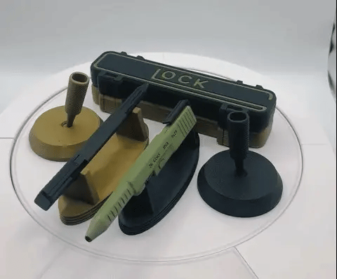 3D printed design inspired by the iconic Glock handgun (non-functional & safe) Fitted with a Pilot G2 ink refill – writes smoothly and can be replaced Lightweight, durable PLA body with a bold aesthetic Great as a desk statement piece, gift, or collector’s item Options available: Pen only Pen with a matching 3D printed case Pen with a matching 3D printed case and 2 different styles of holders (display stands)